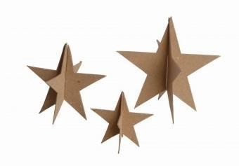 Súprava lepenkových tvarov na výrobu 3D dekorácií v tvare hviezd. Lepenku je možné pomaľovať, polepiť či inak odokorovať. Súprava je vhodná na vytváranie väčších 3D dekorácií. Množstvo v balení: 3 ks (hviezda s výškou 18 cm, 13 cm a 9 cm)