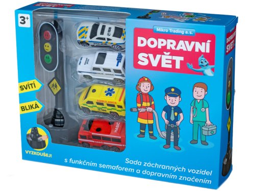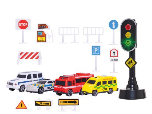 Súprava áut 4 ks 7 cm s dopravnými značkami a semaforom na batérie so svetlom