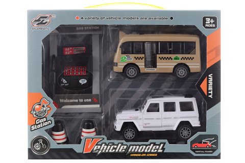 Sada 2 áut a benzínky na batérie. Benzínka vydáva zvuky tankovania a melódiu. Napájanie na 3xAG13 batérie (sú súčasťou balenia). Autá na zotrvačník. Balené v krabici. Rozmery balenia cac 26x20x7 cm. Vek 3+
