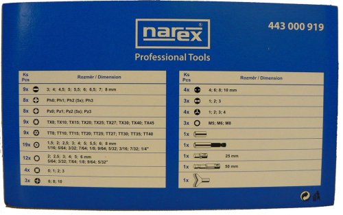 Súprava bitov renomovanej českej značky Narex obsahuje 100 kusov náradia. V praktickom kufríku z odolného plastu tak nájdete bity zo špeciálneho Chróm vanádiového povrchu. Pevný plastový zakladač s dlhou životnosťou je vlisovaný do robustnej odolnej kazety s poistným zámkom, ktorý zabraňuje samovoľnému otvoreniu.