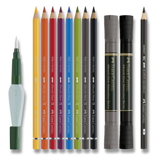 Sada obsahuje:, * akvarelovú grafitovú ceruzku Graphite Aquarelle (tvrdosť 2B), * 2x akvarelové popisovače Albrecht Dürer, * 8x akvarelové pastelky Albrecht Dürer, * štetec so zásobníkom na vodu