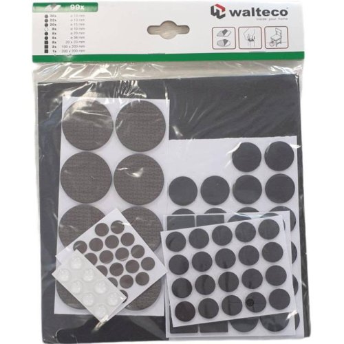 Súprava obsahuje: Filcové podložky: O 22 mm - 22x, O 15 mm - 20x, 100x200 mm - 2x, 200x200 mm - 1x Podložky EVA: 20x20 mm - 8x, O 20 mm - 8x, O 10 mm - 22x - 8x Tlmič dvierok: O 10 mm - 8x