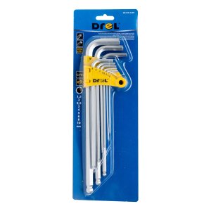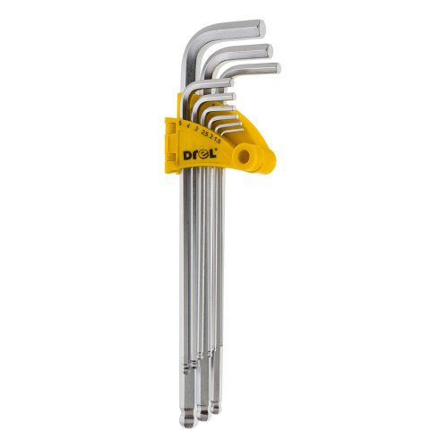 Sada 9 šesťhranných kľúčov s guličkovým zakončením z chrómovanej ocele. Veľkosti od 1,5 mm do 10 mm.