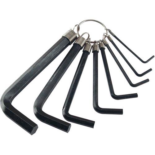 Súprava najpoužívanejších rozmerov šesťhranných kľúčov, tvrdených v celej dĺžke, ktoré sú zavesené pružnými závesmi na krúžku.