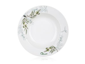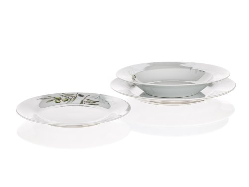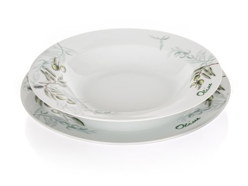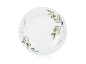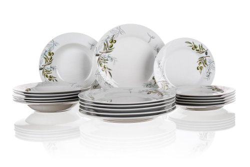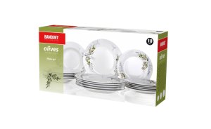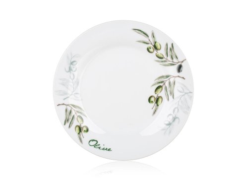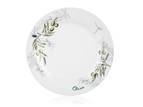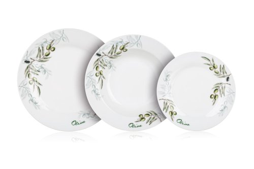 18dielna tanierová sada OLIVES s dekórom olivy, je vyrobená z porcelánu. Taniere je možné používať do mikrovlnnej rúry a umývať v umývačke riadu.
