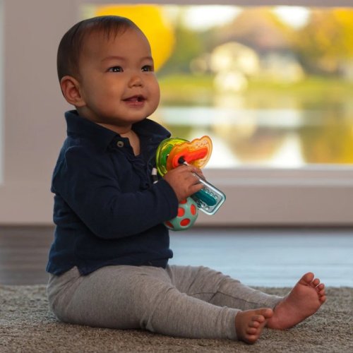 • guličky ukryté v loptičke pri pohybe hrkajú a tým rozvíja zručnosť lokalizácie zvukov