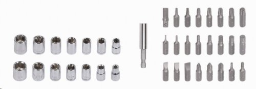 41dielna sada flexibilného račňového skrutkovača, skrutkovacích bitov a nástrčných kľúčov v plastovom kufríku .