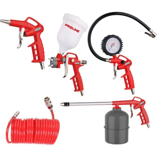 sada obsahuje: lakovaciu pištoľ s hornou nádržou, nafukovacia pištoľ, umývacia pištoľ, ofukovacia pištoľ, PU špirálová pneumatická hadica