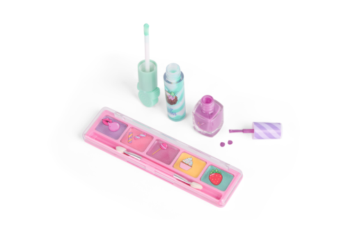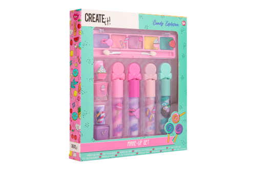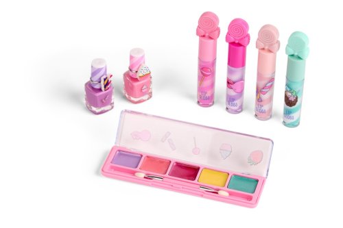 Súprava maľovátok Candy Creat it! Súprava obsahuje päť ks očných tieňov, alplikátor, štyri lesky na pery, dva laky na nechty + dva prstienky.