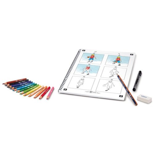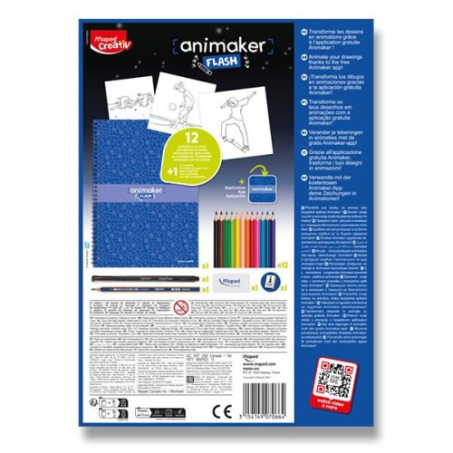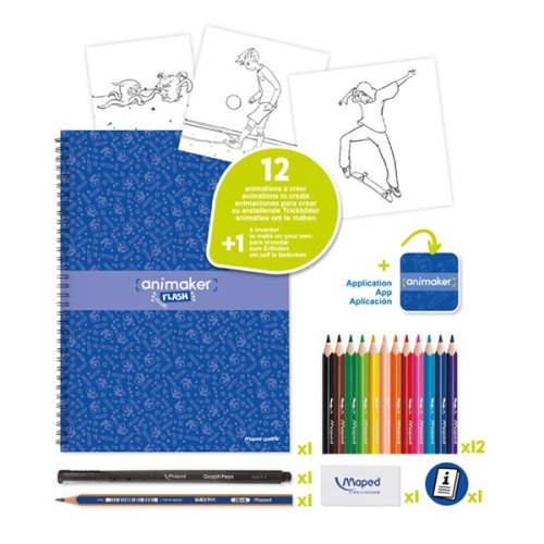 Sada obsahuje:, * špirálový zošit A4 (12 + 1 predloha), * 12 pasteliek Strong Mini Maped, * 1 čierny liner Graph'Peps Maped, * 1 grafitovú ceruzku Black'Peps Navy Maped, * guma, * manuál + QR kód