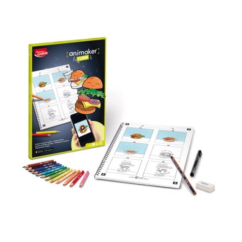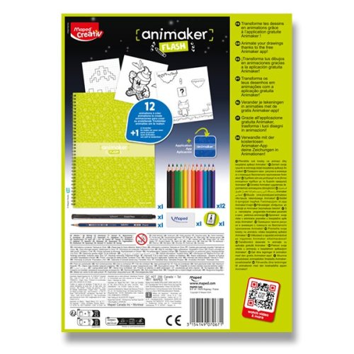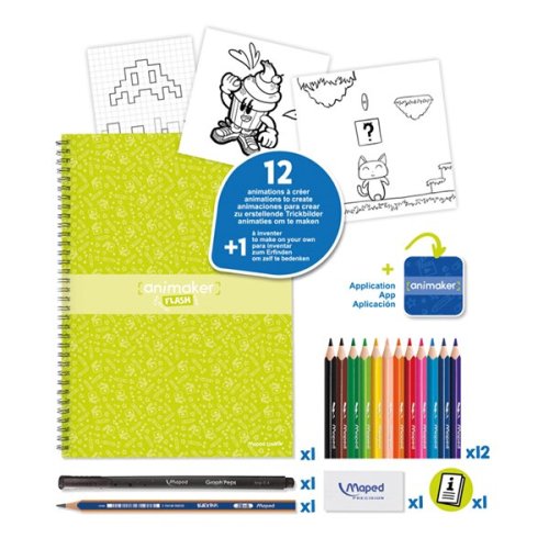 Sada obsahuje:, * špirálový zošit A4 (12 + 1 predloha), * 12 pasteliek Strong Mini Maped, * 1 čierny liner Graph'Peps Maped, * 1 grafitovú ceruzku Black'Peps Navy Maped, * guma, * manuál + QR kód