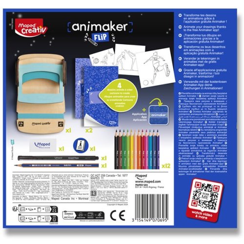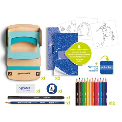 Sada obsahuje:, * 1 drevený stojan s gumičkou pre uchytenie flip bloku, * 2 flip bloky, * 12 pasteliek Strong Mini Maped, * 1 čierny liner Graph'Peps Maped, * 1 grafitovú ceruzku Black'Peps Navy Maped, * guma, * manuál + QR kód