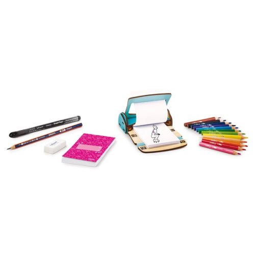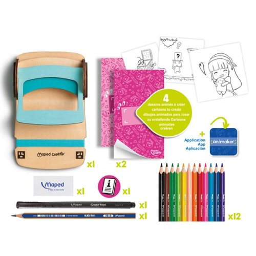 Sada obsahuje:, * 1 drevený stojan s gumičkou pre uchytenie flip bloku, * 2 flip bloky, * 12 pasteliek Strong Mini Maped, * 1 čierny liner Graph'Peps Maped, * 1 grafitovú ceruzku Black'Peps Navy Maped, * guma, * manuál + QR kód