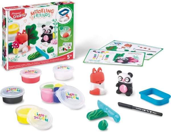 Kreatívna sada na modelovanie pre deti od 5 rokov. Ideálny pomocník na vymodelovanie a ozdobenie roztomilých figúrok pandy a lišiaka pomocou tvrdnúcej hmoty a priloženého náradia., Vymodelovaná figúrka po 4 hodinách zatvrdne v pevnú dekoráciu. g), * čierny fix, * plastový nožík, * 2 farebné predlohy, Maped Creativ je kolekcia kreatívnych sád francúzskej značky Maped, tradičného výrobcu kvalitných školských a kancelárskych potrieb. Kolekcia Maped Creativ v niekoľkých radoch ponúka, kreatívne vyžitie pre deti od 1 roku - edícia EARLY AGE, až do veku 6+ - edícia BOARD ACTIVITIES. Edícia MINIBOX je vhodným darčekom pri každej návšteve rodín s deťmi. Edícia COLOR PLAY pre, deti od 4 rokov zas posúva hranice kreatívneho tvorenia k ďalšiemu hraniu.