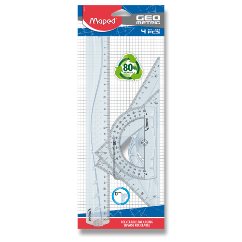 4dielna sada Maped Geometric Maxi rysovacích potrieb s vysoko kvalitným značením. Stupnice sú vytlačené za použitia UV atramentu a sú maximálne odolné. Súprava obsahuje: