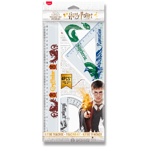 4dielna sada rysovacích potrieb s atraktívnym dizajnom Harryho Pottera obsahuje pravítko 30 cm, trojuholník 60 ° / 21 cm, trojuholník 45 ° / 21 cm a uhlomer 180 ° / 12 cm.