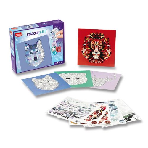 Sada obsahuje:, * 4 kartónové karty (20 x 20 cm), * 5 hárkov samolepiacich etikiet, * 1 kartónový klin, ktorý sa zmení na stojan, * návod na použitie
