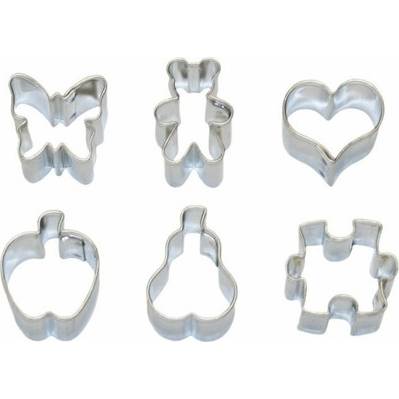Sada 6tich mini vykrajovačov (motýlik, medvedík, srdce, puzzle, hruška, jablko) z pocínovaného plechu.