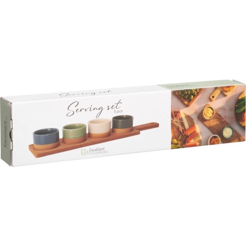 Táto elegantná servírovacia sada kombinuje funkčnosť a prírodnú krásu. Štyri kameninové misky v tlmených farbách sú usadené na podlhovasté doske z tmavého bambusu – ideálne na servírovanie omáčok, dipov, orieškov alebo sladkostí. Skvele zapadne do každej kuchyne aj na slávnostne prestretý stôl.