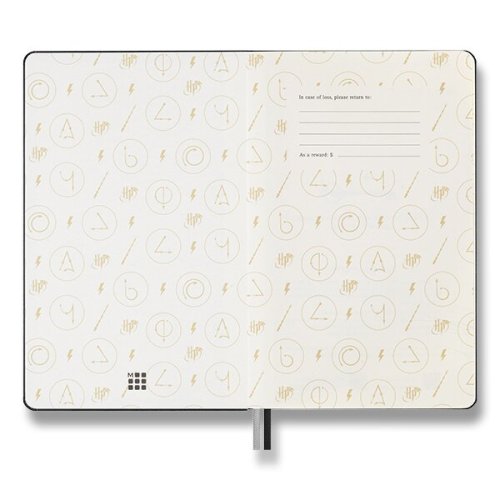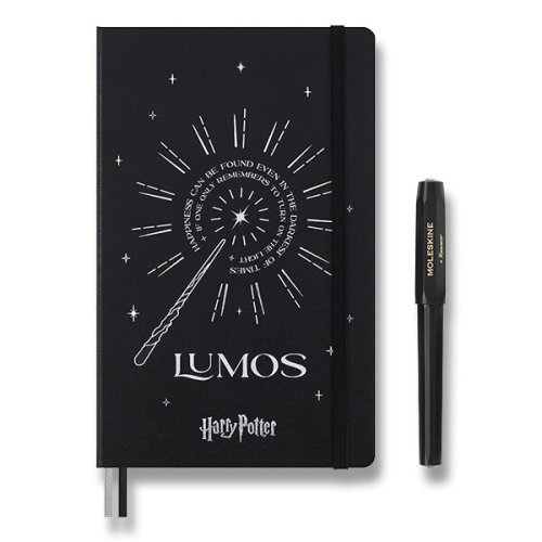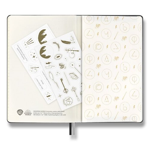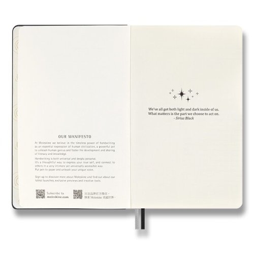Sada obsahuje:, Zápisník Moleskine Harry Potter - tvrdé dosky, Rozmer: 13 x 21 cm, 88 listov, linajkový, gramáž papiera 100 g/m², • linajkový, veľkosť L, • pevná v chrbte šitá väzba v kartónových doskách proti čiernej farbe, • dosky obopnuté vizitky a drobnosti, • textilná záložka a letákom s históriou MOLESKINE, • vrátane tematických samolepiek, • neobsahuje kyseliny, • papier má slonovinovú farbu, • papier vyrobený z FSC certifikovaného dreva, Roller Moleskine Kaweco, Šírka hrotu je 1 mm., • vymeniteľná plastová kovová • úchop, • farba náplne je čierna, Diár je v anglickom jazyku., Dodávané v elegantnom kartónovom darčekovom boxe.