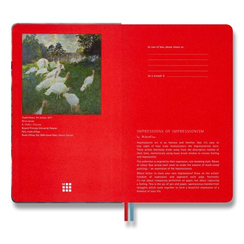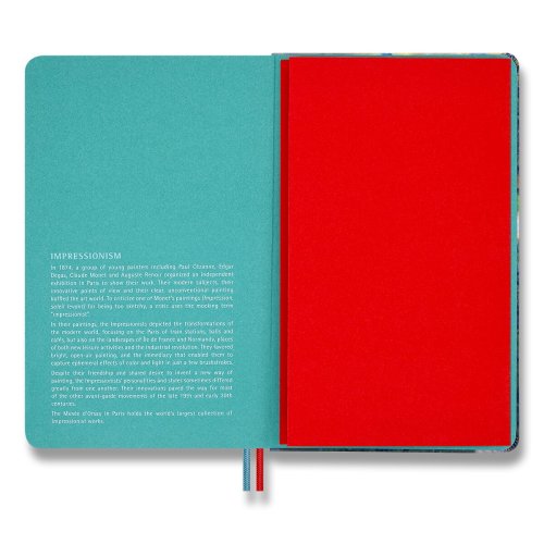 ZÁPISNÍK MOLESKINE IMPRESSIONISM - TVRDÉ DOSKY, Zápisník s pevnou, v chrbte šitou väzbou v kartónových doskách potiahnutých látkou obopnuté pružnou páskou proti samovoľnému otváraniu. Zápisník vybavený vreckom na vizitky a drobnosti, ktoré je vyrobené z tkaniny a kartónu, dvojitou textilnou záložkou, tematickou pohľadnicou a letákom s históriou MOLESKINE., Gramáž papiera 100 g/m², neobsahuje kyseliny. Papier v slonovinovej farbe, vyrobený z FSC certifikovaného dreva., ROZMER: 13 x 21 cm, 88 listov, linajkový, , Dodávané v kartónovom darčekovom boxe