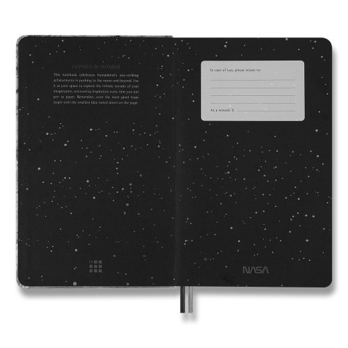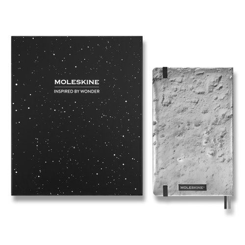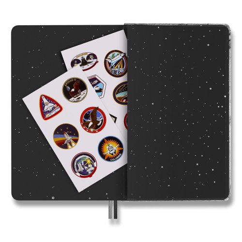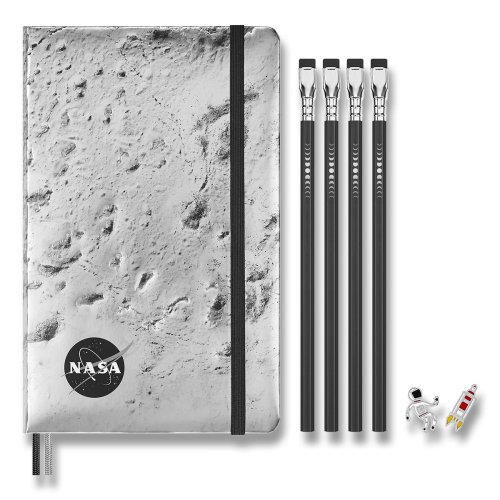 ZÁPISNÍK MOLESKINE NASA-INSPIRED - TVRDÉ DOSKY, Zápisník s pevnou, v chrbte šitou väzbou v kartónových doskách potiahnutých látkou obopnuté pružnou páskou proti samovoľnému otváraniu. Zápisník vybavený vreckom na vizitky a drobnosti, ktoré je vyrobené z tkaniny a kartónu, dvojitou textilnou záložkou, 2 listy tematických samolepiek, striebornou záložkou s metalickým efektom a letákom s históriou MOLESKINE., Gramáž papiera 100 g/m², neobsahuje kyseliny. Papier v slonovinovej farbe, vyrobený z FSC certifikovaného dreva., ROZMER: 13 x 21 cm, 88 listov, linajkový., , GRAFITOVÁ CERUZKA BLACKWING - 4 KS, Grafitová ceruzka v limitovanom prevedení NASA-inspired s prémiovým japonským grafitovým jadrom. boxu.