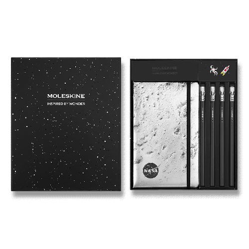 ZÁPISNÍK MOLESKINE NASA - TVRDÉ DOSKY, Zápisník s pevnou, v chrbte šitou väzbou v kartónových doskách potiahnutých látkou obopnuté pružnou páskou proti samovoľnému otváraniu. Zápisník vybavený vreckom na vizitky a drobnosti, ktoré je vyrobené z tkaniny a kartónu, dvojitou textilnou záložkou, 2 listy tematických samolepiek, striebornou záložkou s metalickým efektom a letákom s históriou MOLESKINE., Gramáž papiera 100 g/m², neobsahuje kyseliny. Papier v slonovinovej farbe, vyrobený z FSC certifikovaného dreva., ROZMER: 13 x 21 cm, 88 listov, linajkový., , GRAFITOVÁ CERUZKA BLACKWING - 4 KS, Grafitová ceruzka v limitovanom prevedení NASA s prémiovým japonským grafitovým jadrom a gumou.