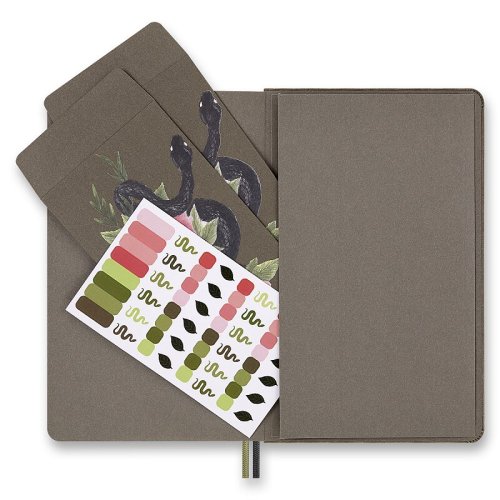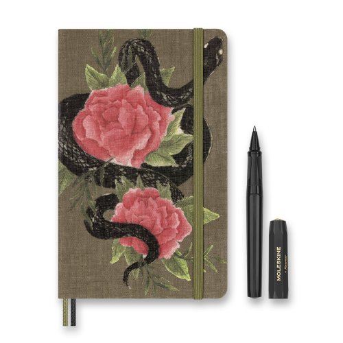 Zberateľská edícia zápisníka Moleskine Snake Roses veľkosti L z kolekcie Year of the Snake., pevná, v chrbte šitá väzba v kartónových doskách potiahnutý látkou s motívmi hada, ktorý harmonicky splýva s odkvetnými lístkami dvoch kvetov v jeho prirodzenom prostredí tropickej, zelene. Textilný materiál dosiek pripomína surové plátno a vzdáva hold umeleckej a tvorivej podstate hada. Dosky sú obopnuté pružnou páskou proti samovoľnému otváraniu. Zápisník, vybavený vreckom na vizitky a drobnosti, ktorá je vyrobená z tkaniny a kartónu, dvojitou textilnou záložkou, 2 listy tematických samolepiek, 2 tematickými obálkami a letákom s históriou MOLESKINE., Gramáž papiera 100 g/m², neobsahuje kyseliny., Rozmery 1, 8. Zápisník je v anglickom jazyku.
