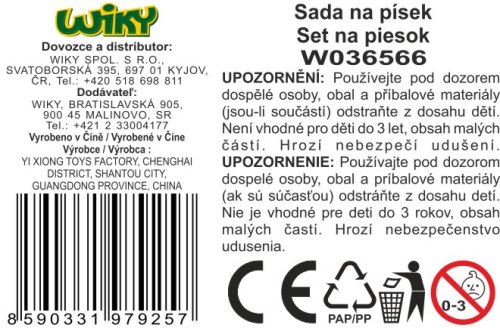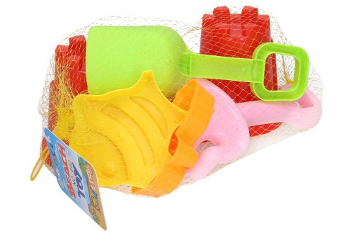 Súprava na piesok. Veľkosť hradu 22 cm. Obsah balenia - 3 formičky (hrad, ryba, chobotnica) lopatka, hrabličky.