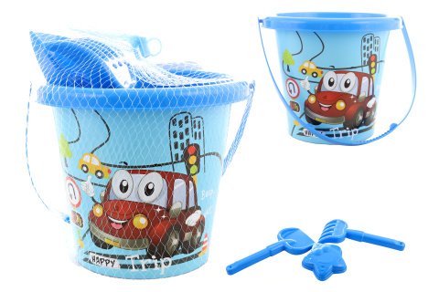 Súprava na piesok obsahuje kýblik, hrabličky, lopatku a formičku v tvare hviezdičky. Balené v sieťke. Rozmery vedierka cca 13x15 cm. Vek 3+