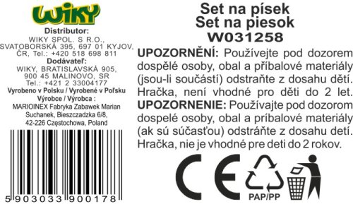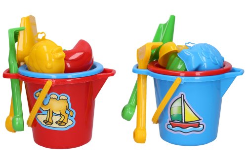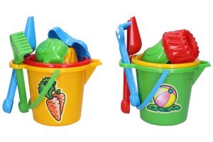 Súprava na piesok malá kýblik s výlevkou 16x11 cm. Obsah balenia - kýblik 16x11cm, sitko, hrable, lopatka, 3xformičky (bábovka, rybka, kačička). 4 varianty - červená, modrá, zelená, žltá.