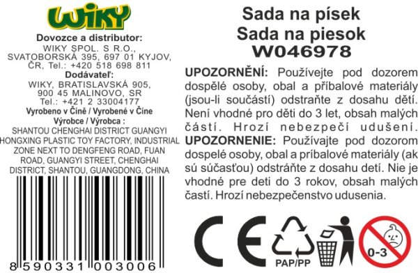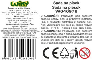 Súprava na piesok mlynček 10 ks. Rozmery 17x11x23 cm. Súčasťou mlynček, 2 lopatky, hrabličky, sitko, formičky.