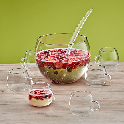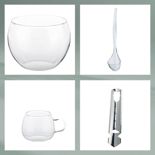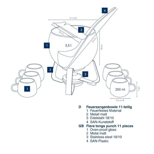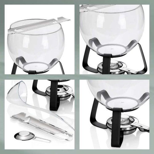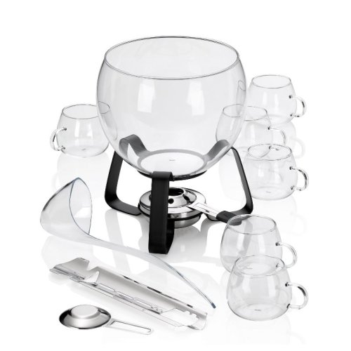 Pre štýlové večery s priateľmi. Súprava obsahuje: - žiaruvzdornú sklenenú punčovú misu, - objem 3,5 l, - 6 pohárov, - akrylovú naberačku, - nerezové kliešte na cukor, - kovový stojan priemer 13,5 cm, - bezpečnostný horák na pastu z nerezovej ocele.Upozornení : Nelejte rum priamo na horák.