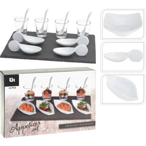 • servírovací set misiek (kanapiek) a pohárov s lyžičkou na tácke pre najrôznejšie príležitosti - materiál: porcelán / sklo / bridlice - farba: biela / transparentná / šedá - perfektný pre servírovanie predjedál, pochutín, dipov a omáčok - vhodné do umývačky riadu - sada obsahuje bridlicový podnos s protišmykovými nôžkami, 4 porcelánové misky (kanapky), 4 poháre a 4 porcelánové lyžičky - rozmery podnosu: 295 x 200 x 5mm - rozmer pohárov: pr. 42 x 60 mm - priemer dna pohárov: 42 mm - rozmer lyžičiek: 92 x 20 mm - tvar misky (kanapky): loďka - značka: Excellent Houseware