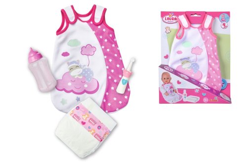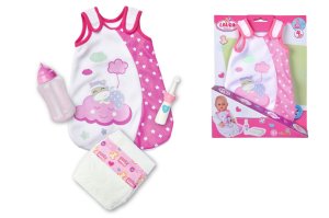 Sada na spanie obsahuje spací vak, zubnú kefku, plienku a fľaštičku pre bábiky o veľkosti 30-38 cm.