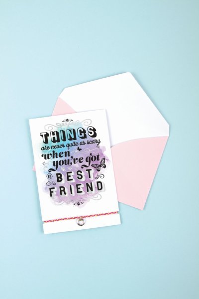 Vytvorte náramky priateľstva a rafinovanú kartu, ktorú môžete darovať alebo si nechať len pre seba! Použite fixky a pipetu na vytvorenie akvarelového dizajnu. Potrite kartu atramentom a vodou. Na vyplnenie použite gélové perá, písmená alebo si vytvorte svoj vlastný dizajn. Vyrobte si náramok priateľstva, priložte ho do karty k darčekovej obálke. Vaše premyslené, ručne vyrobené majstrovské dielo poteší každého priateľa. Vek od 8+.
