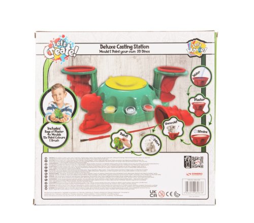 Sada na výrobu sadrových figúrok Dino DeLuxe – sada obsahuje všetko, čo potrebujú na výrobu 8 detailných figúrok dinosaurov, vrátane sadry, formičiek, 5 farieb farieb a štetca. Deti môžu popustiť uzdu svojej kreativite tým, že naplnia formičky sadrou a potom svoje figúrky dinosaurov vyfarbia žiarivými farbami. Táto zábavná a vzdelávacia aktivita stimuluje predstavivosť, podporuje jemné motorické schopnosti. Skvelý darček pre mladých paleontológov.