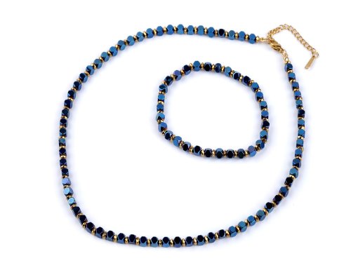 Luxusná sada náhrdelníka a náramku je vyrobená z brúsených korálikov pokovovaného hematitu a kvalitnej nerezovej ocele. Je veľmi elegantný, patrí medzi šperky, ktoré vďaka svojej fascinujúcej povrchovej úprave zaujmú na prvý pohľad. Brúsené plôšky vytvárajú efektné svetelné odlesky. Sada poteší každú ženu, je darčekom, s ktorým nešliapnete vedľa. Hodí sa k slávnostným príležitostiam, skvele podčiarkne aj business štýl obliekania. Náhrdelník sa zapína na karabínku a predlžovaciu retiazku. Náramok má vďaka pruženke univerzálnu veľkosť, ľahko sa natiahne na ruku.
