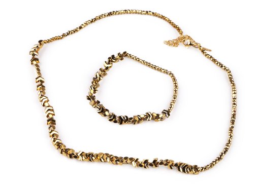 Sada elegantného náhrdelníka a náramku je vyrobená z korálikov pokovovaného hematitu a kvalitnej nerezovej ocele. Patria medzi šperky, ktoré vďaka svojej fascinujúcej povrchovej úprave zaujmú na prvý pohľad, pretože majú efektné svetelné odlesky. Sada poteší každú ženu, je darčekom, s ktorým nešliapnete vedľa. Hodí sa na slávnostné príležitosti aj na bežné nosenie. Náhrdelník sa zapína na karabínku a predlžovaciu retiazku. Náramok má vďaka pruženke univerzálnu veľkosť, ľahko sa natiahne na ruku.