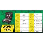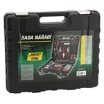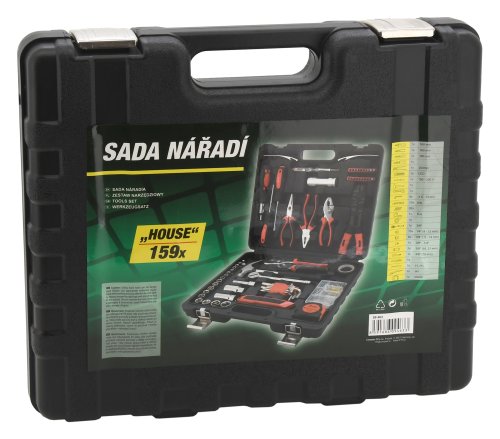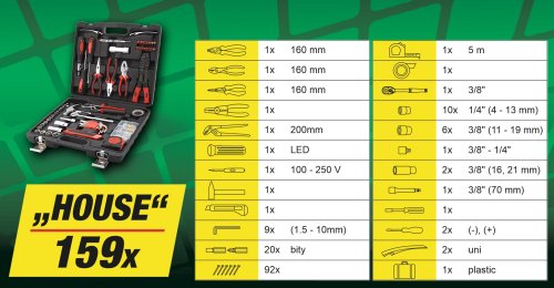 Sada obsahuje ergonomické skrutkovače, imbusové kľúče, žiletkový nôž, najbežnejšie typy klieští vrátane elektrikárskych, kladivo, 3/8" račňu s nástavcami, LED svietidlo, skrutkovač na bity vrátane 20 ks bitov, zvinovací meter s dĺžkou 5 m, izolačný pásik Okrem iného je sada vybavená puzdrom s 92 ks spojovacieho materiálu .