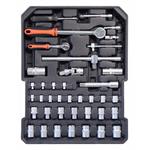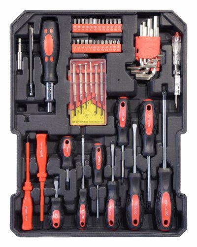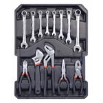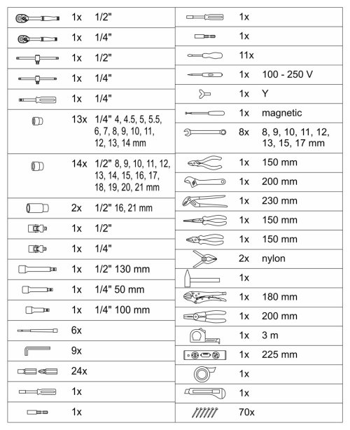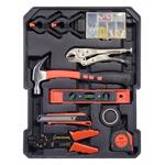 Sada obsahuje celý rad klieští, skrutkovačov, gola kľúčov, kladivo, vodováhu, stranové aj imbus kľúče, bity, základný spojovací materiál a celý rad ďalšieho náradia, ktoré je vhodné na použitie ako doma, v garáži, tak aj na cestách.