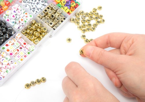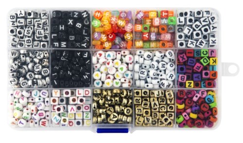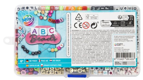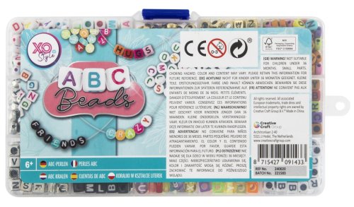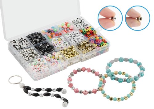 Súprava navliekacích korálikov s písmenkami ABC – súprava obsahuje 15 druhov navliekacích korálikov spísmenky. Uložené v praktickom zatváracom boxe.