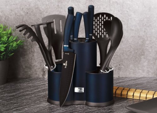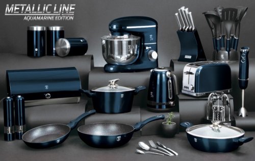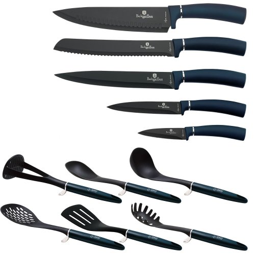 Sada nožov a kuchynského náčinia v stojane 12 ks Aquamarine Metallic Line je výbornou alternatívou pre kuchárov rôznych úrovní, na ktorej výrobu bol použitý kvalitný materiál: nerez oceľ s nepriľnavým povrchom, vynikajú perfektnou ostrosťou čepele a dizajnom . Veľmi oceníte aj ergonomicky tvarovanú rukoväť , vďaka ktorej sa vám nože budú skvele držať. Celá sada je dielom výrobcu BERLINGERHAUS, ktorá sa výrobe nožov venuje pomerne dlho a sú riadne odskúšané.