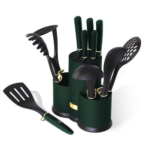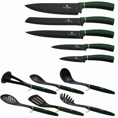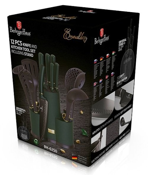 Súprava nožov a kuchynského náčinia v stojane 12 ks Emerald Collection je výbornou alternatívou pre kuchárov rôznych úrovní, na ktorej výrobu bol použitý kvalitný materiál: nerez oceľ s nepriľnavým povrchom, vynikajú perfektnou ostrosťou čepele a dizajnom . Veľmi oceníte aj ergonomicky tvarovanú rukoväť , vďaka ktorej sa vám nože budú skvele držať. Celá sada je dielom výrobcu BERLINGERHAUS, ktorá sa výrobe nožov venuje pomerne dlho a sú riadne odskúšané.