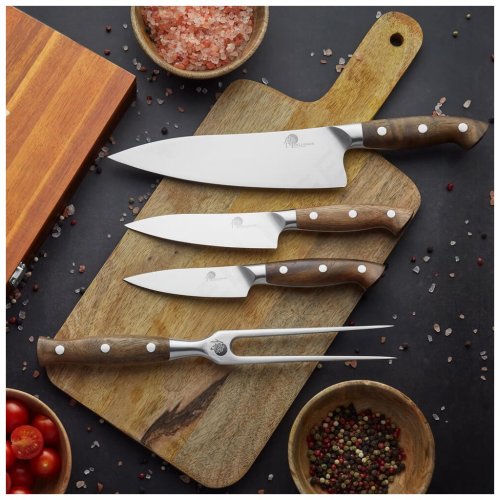 Súprava nožov, ktorá poteší každého vášnivého kuchára. Elegantná štvordielna sada Dellinger Walnut obsahuje 3 kvalitné nože z nemeckej ocele HRC 56-58 a vidličku pre ľahkú manipuláciu s mäsom či zeleninou. Všetko je uložené v luxusnej darčekovej krabici z agátového dreva s kovovým zatváraním.