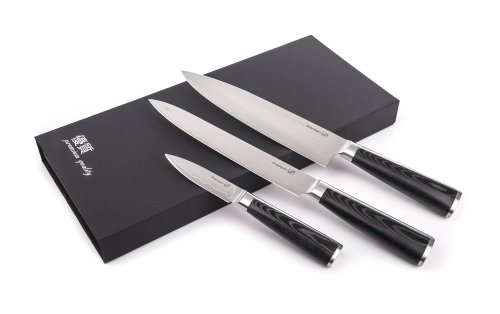 Súprava nožov z damaškovej ocele v kuchyni sú skvelou voľbou. Damascénska oceľ má vyššiu tvrdosť a odolnosť voči opotrebovaniu, vďaka vzácnej a unikátnej kresbe ocele navyše získate jedinečnú kombináciu krásy a luxusu s vynikajúcimi reznými vlastnosťami. V sade nájdete nôž šéfkuchára a krájací nôž s dĺžkou 20 cm a jeden univerzálny nôž s čepeľou o dĺžke 9 cm .