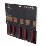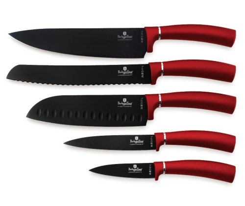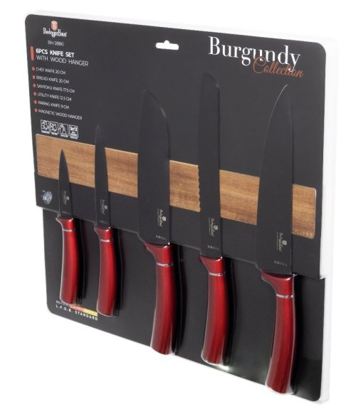 Súprava najpoužívanejších kuchynských nožov z kolekcie Burgundy Metallic Line v kombinácii čiernej a červenej farby. Navyše s praktickým magnetickým držiakom na stenu či stenu , na ktorom budú nože vždy prehľadne uskladnené. Nepriľnavé nože môžete brúsiť štandardne ocieľkou, brúskom alebo na brúsnom kameni, rovnako ako ste zvyknutí pri klasických nožoch.