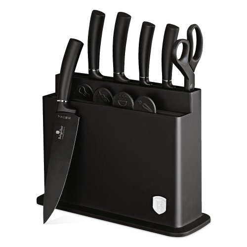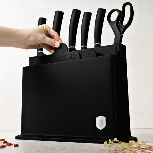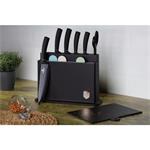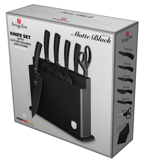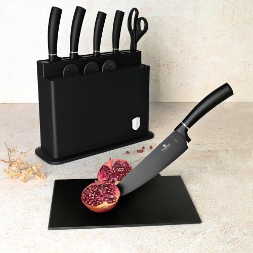 - Materiál: nerezová oceľ s čiernou nepriľnavou vrstvou- Krájacia doska 4 ks- Čierny stojan- Nôž na chlieb 20 cm- Kuchársky nôž 20 cm- Krájací nôž 20 cm- Úžitkový nôž 12,5 cm- Nôž na okrajovanie 9 cm- Nožnice-