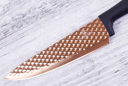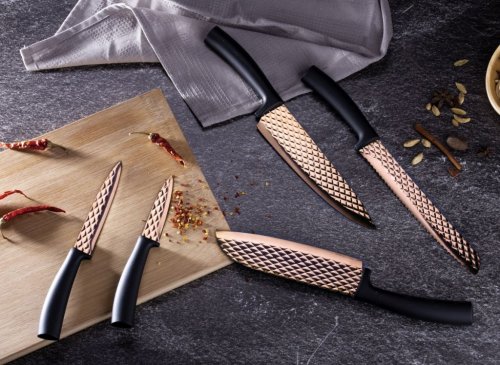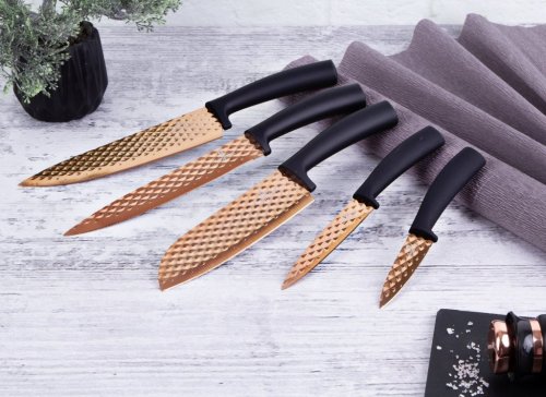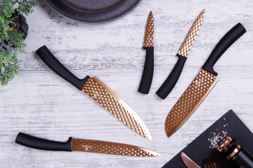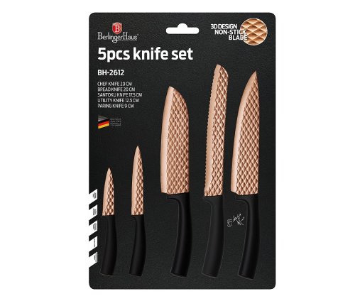 Súprava nožov s nepriľnavým povrchom 5 ks Black Rose Collection je výbornou alternatívou pre kuchárov rôznych úrovní, na ktorej výrobu bol použitý kvalitný materiál: nerez oceľ s nepriľnavým povrchom, vynikajú perfektnou ostrosťou čepele a dizajnom . Veľmi oceníte aj ergonomicky tvarovanú rukoväť , vďaka ktorej sa vám nože budú skvele držať. Celá sada je dielom výrobcu BERLINGERHAUS, ktorá sa výrobe nožov venuje pomerne dlho a sú riadne odskúšané.