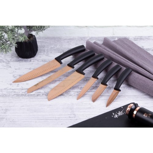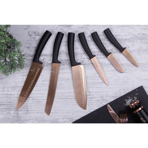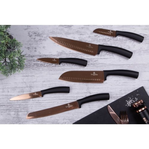 Sada nožov s nepriľnavým povrchom 11 ks Rosegold Metallic Line je výbornou alternatívou pre kuchárov rôznych úrovní, na výrobu ktorých bol použitý kvalitný materiál: nerez oceľ s nepriľnavým povrchom, vynikajú perfektnou ostrosťou čepele a dizajnom . Veľmi oceníte aj ergonomicky tvarovanú rukoväť , vďaka ktorej sa vám nože budú skvele držať. Celá sada je dielom výrobcu BERLINGERHAUS, ktorá sa výrobe nožov venuje pomerne dlho a sú riadne odskúšané.